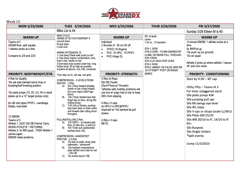 It’s the end of March…end of the first quarter and time is flying! This is our last solid week in March and we have Sandy advancing to Quarterfinals for the CF Games at the end of this week. Starting Thursday the 26th we’ll receive the workouts and have until Monday to do them. We do not yet have an arrangement with where or how we’ll do them, but stay tuned. We’ll make announcements in class. After Quarterfinals, we expect her to advance to Semifinals, which are May 7 – 11.